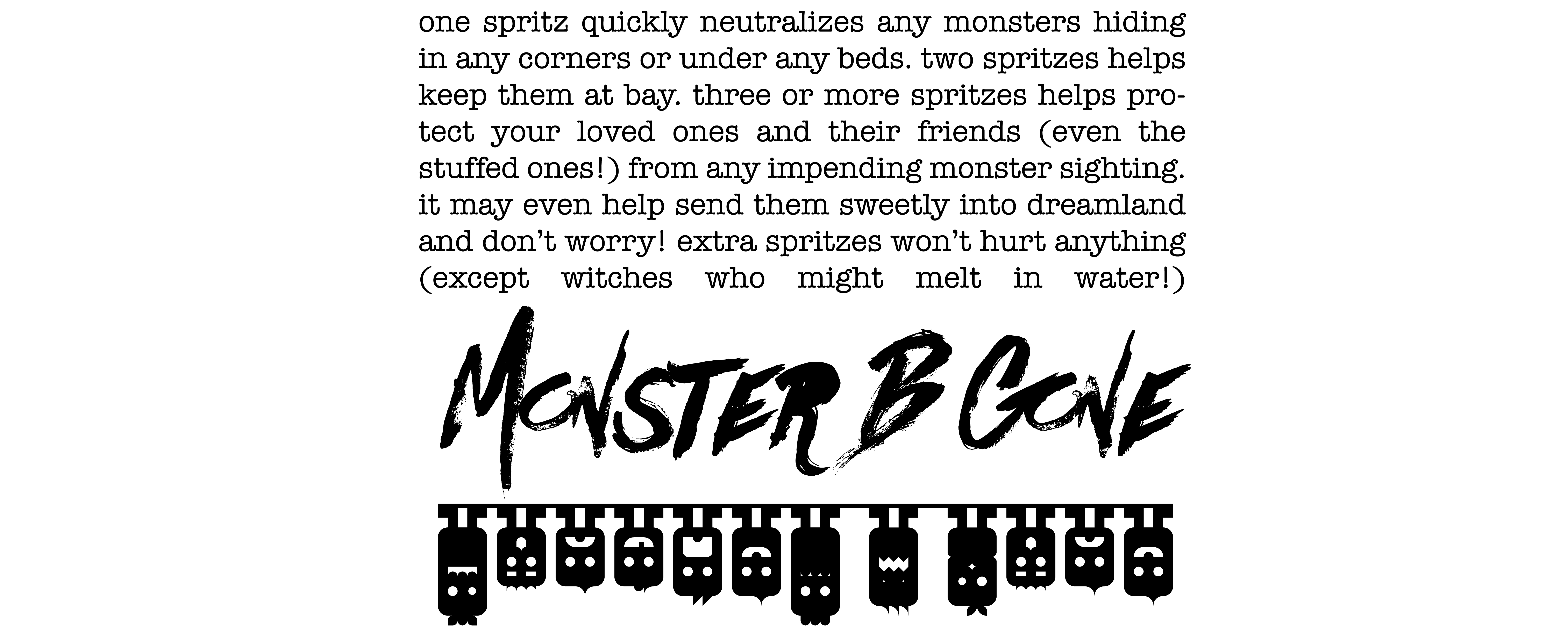 This Monster B Gone free printable label is designed to be printed landscape, and should be (including intentional white space!) 10″x4″. Ten inches should be long enough to wrap around most any spray bottle, and four inches high means it should be a good height. The actual printing is only about 5 inches, so it shouldn’t overlap on most bottles.